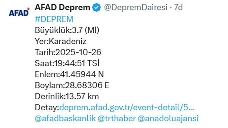 AFAD, merkez üssü Karadeniz olan depremin büyüklüğünü 3.7 olarak açıkladı. Saat 19.44’te meydana gelen deprem, İstanbul ve çevresinde de hissedildi.